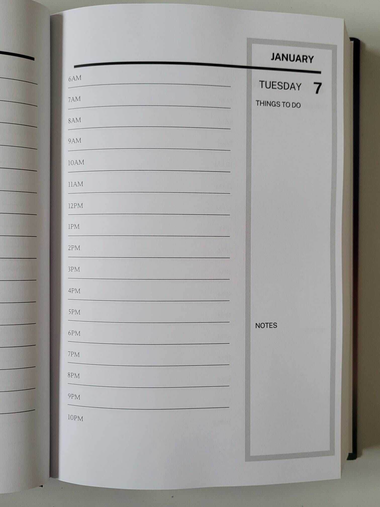 Daily Planner with hourly schedule, space for important tasks and some notes;